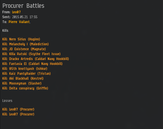 Some guys like to break the meta and to be creative about PvP, one of those guys is Leo07 that came with a Procurer (yes, a Procurer) fit which pretty much fucked anything that you will encounter in a FW battle. Below are some of his best preys (and two loses, but the fit pays of in my opinion), really impresive!
